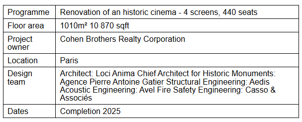 In addition to Loci Anima, the project team includes Agence Pierre Antoine Gatier, Chief Architect for Historic Monuments, ensuring respect for heritage conservation. Technical expertise is provided by Aedis (structure), Avel (acoustics), and Casso & Associés (fire safety). The client is the Cohen Brothers Realty Corporation.